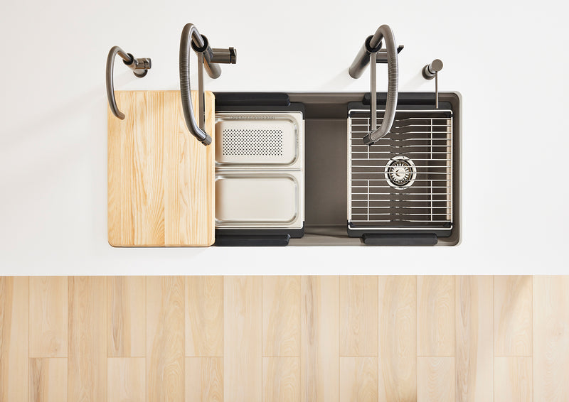 The BLANCO UNIT is the ultimate kitchen water hub - A seamless, fully integrated solution designed to make everyday life effortless. By combining a BLANCO sink, faucet, organization system, and smart accessories, it transforms your sink area into a streamlined workstation where drinking, prepping, and cleaning all happen in one efficient, beautiful space.