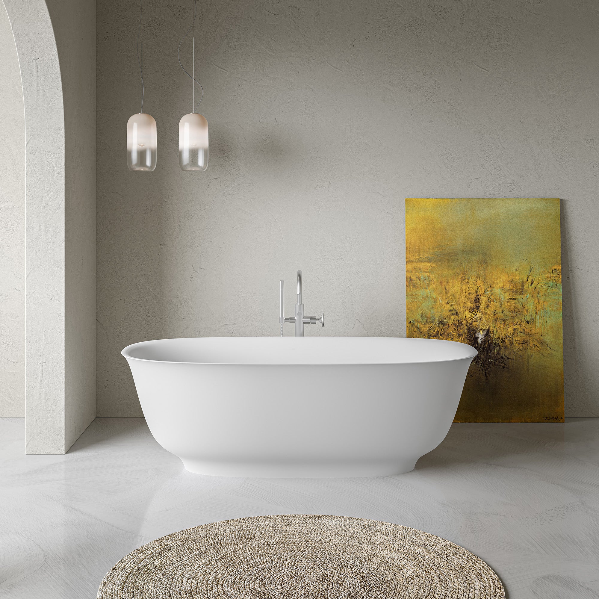 The StoneTouch Termoli solid surface freestanding bathtub blends artisanal craftsmanship with practical performance, making it a standout centerpiece for your bathroom. Crafted from Cristalplant® solid surface sourced from the Dolomites Mountains in Italy, this bathtub offers a resilient, antibacterial surface that stands up to everyday use while remaining pleasant to the touch. Its comfortable, vase-inspired shape balances space and form, making it suitable for long soaks or daily use.